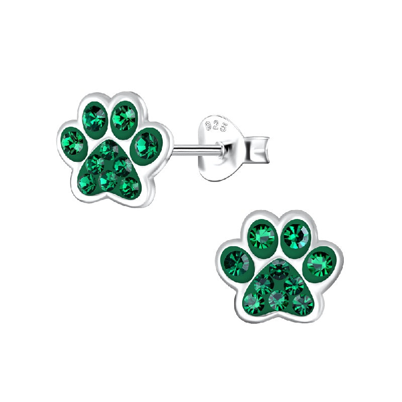 Children's Sterling Silver 'Emerald Green Sparkle Paw' Crystal Stud Earrings
