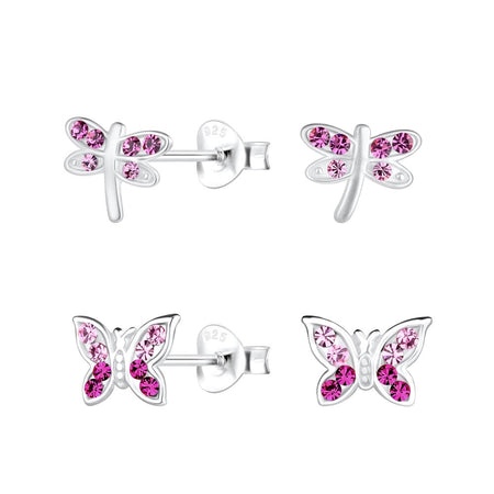 Children's Sterling Silver Set of 2 Pairs of Dragonfly and Butterfly Crystal Stud Earrings