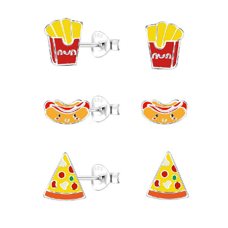 Children's Sterling Silver Set of 3 Pairs of 'Food Lovers' Themed Stud Earrings